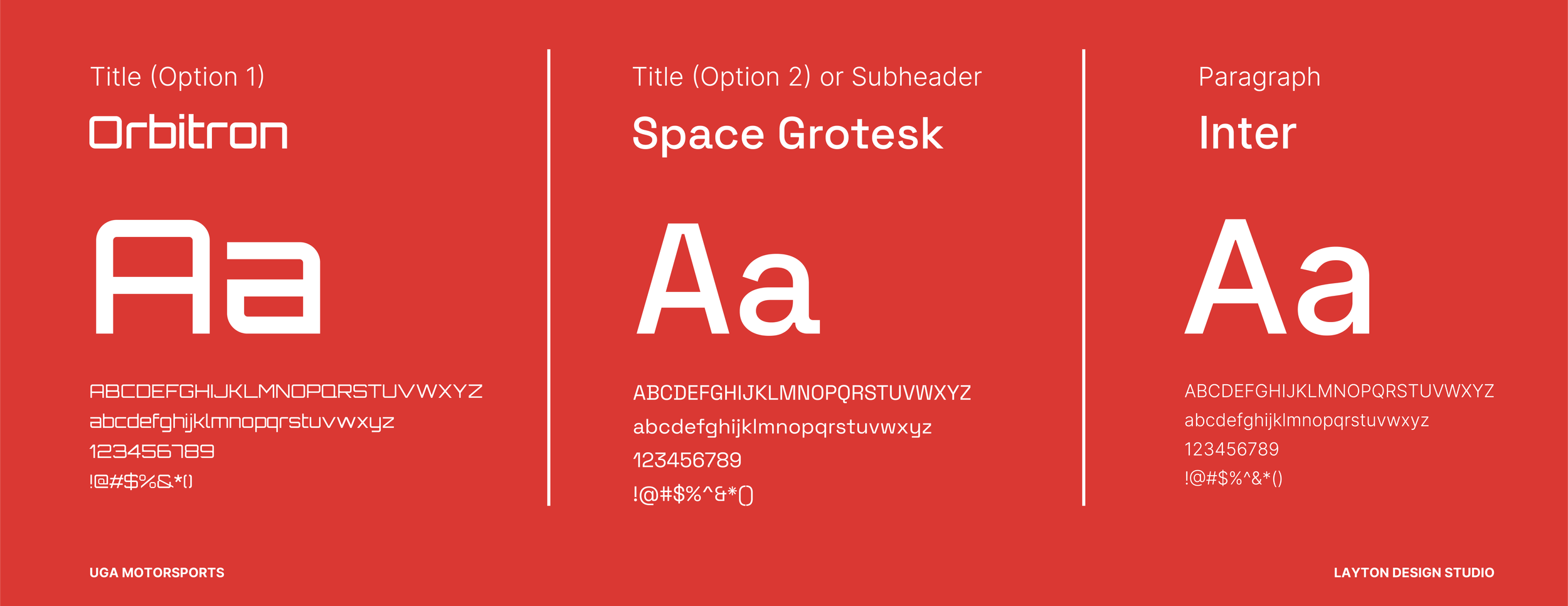 As an Art Director for Layton Design Studio I worked with my team of designers to create a new brand identity for UGA Motorsports. The goal of the project was to find where the rubber meets the road, bridging function and aesthetics